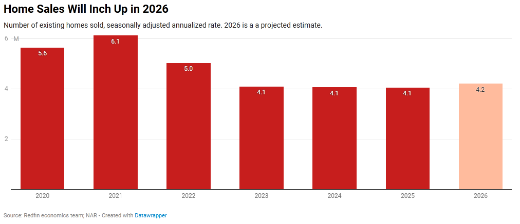 Redfin expects existing home sales to rise about 3 percent in 2026, reaching an annualized pace of roughly 4.2 million sales nationwide. This is not a surge. It is a cautious step forward.