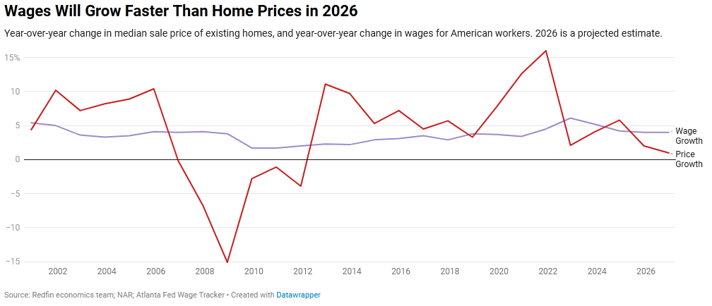 For the first time since the aftermath of the Great Recession, wages are projected to grow faster than home prices for a sustained period. Redfin estimates national home prices will rise only about 1 percent in 2026, while wages continue to climb at a steadier pace.