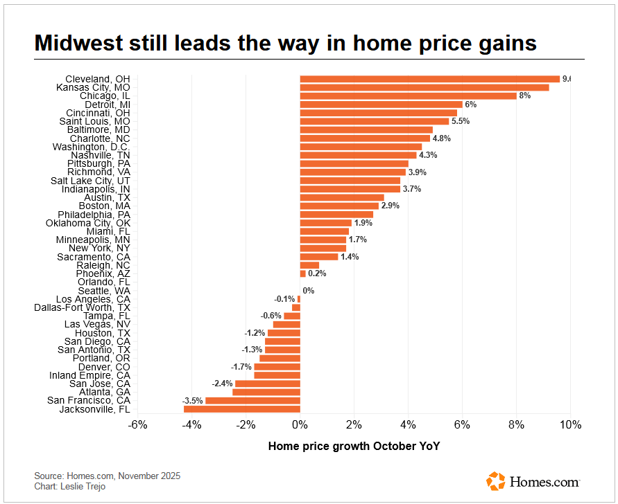 Regionally, the contrast is clear. Out of the 40 largest metro areas tracked by Homes.com, only six recorded price growth above 5%, and all of those markets were located in the Midwest. In comparison, many cities across Florida, Texas, and California experienced outright price declines. Nearly one third of the 1,000 individual markets analyzed posted lower median prices than the year prior.